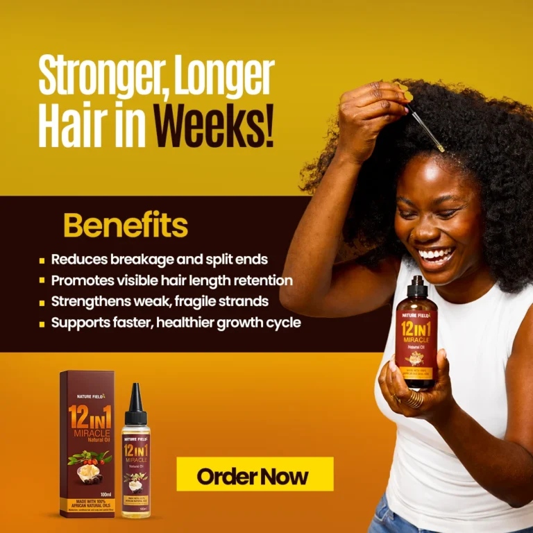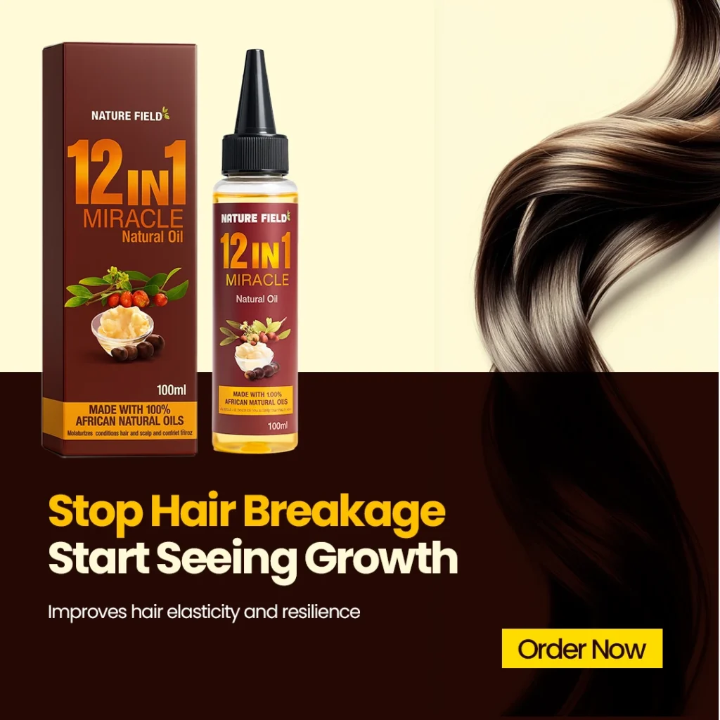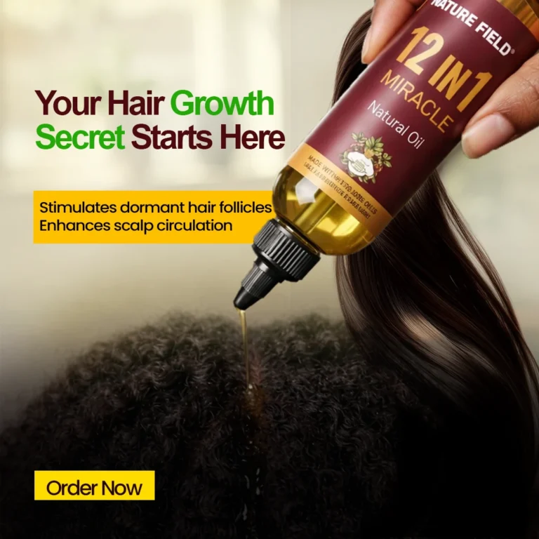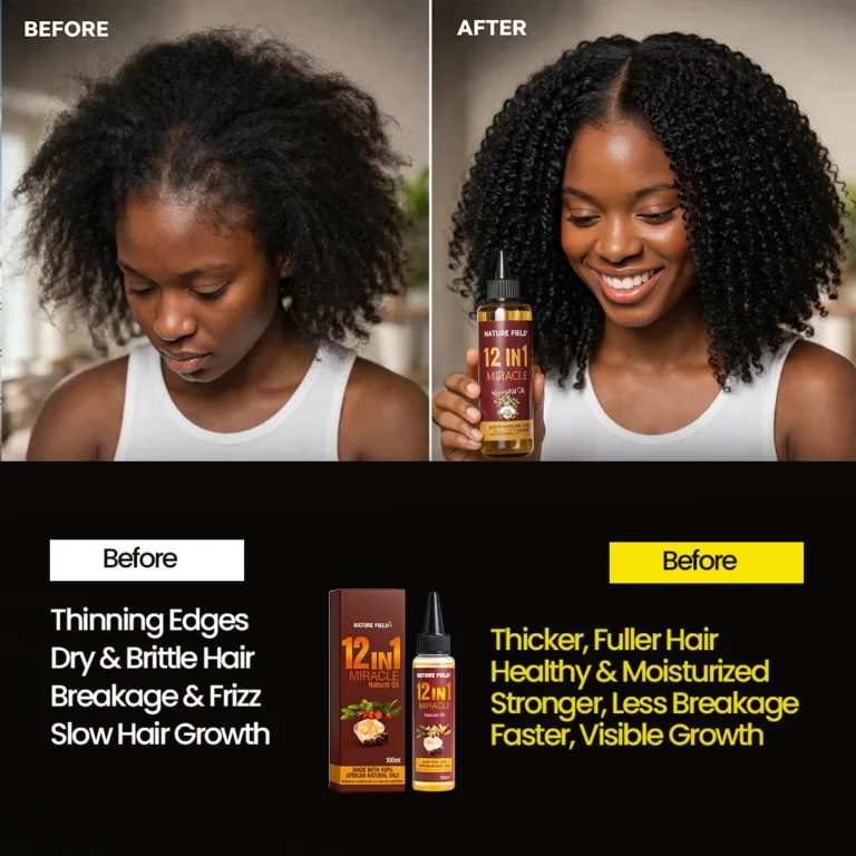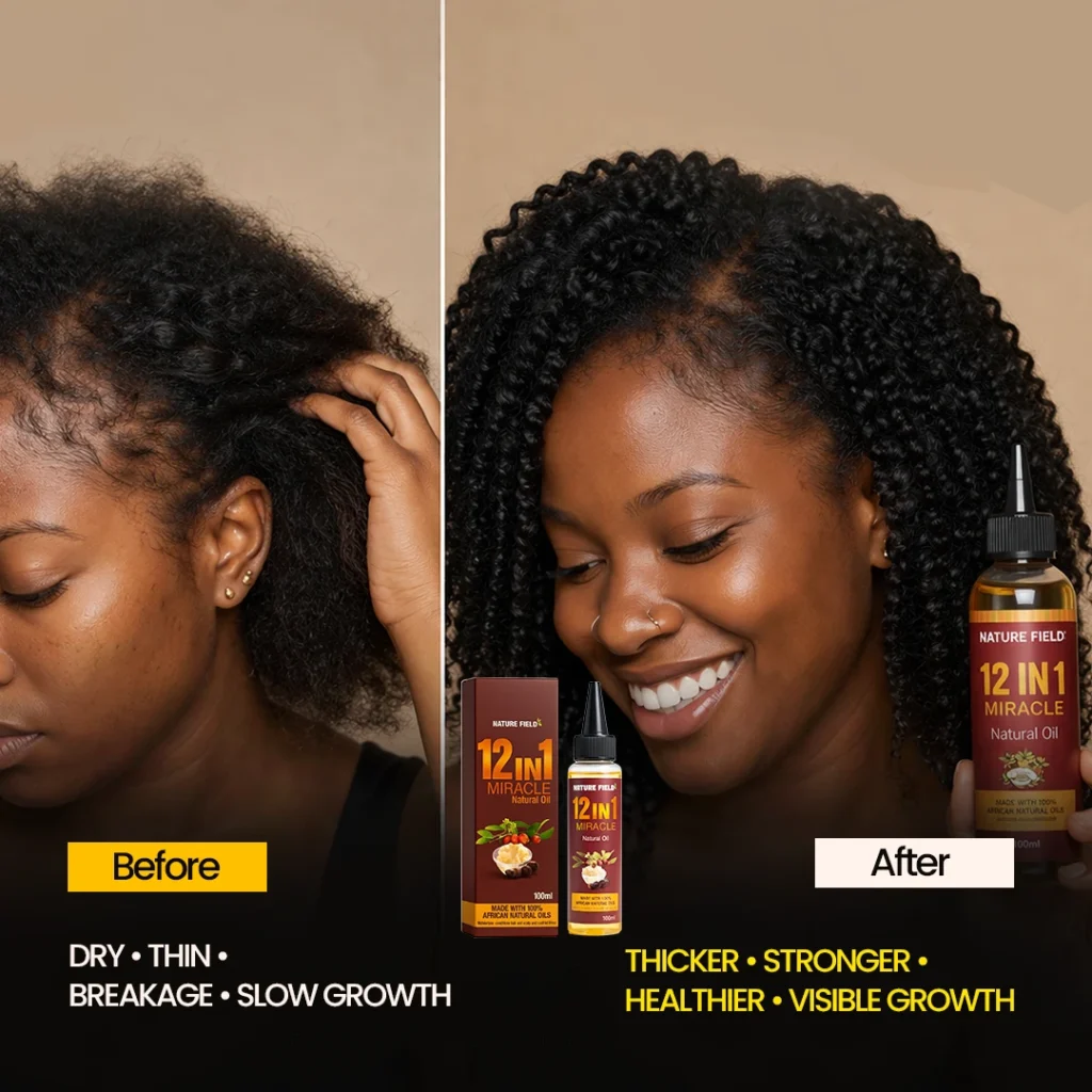 The 12in1 Miracle Oil is a powerful, all-in-one natural hair growth formula designed specifically for Nigerian women. This premium blend combines 12 potent natural ingredients into one highly effective oil that targets breakage, edges, bald spots, and slow growth – delivering real, noticeable results.
